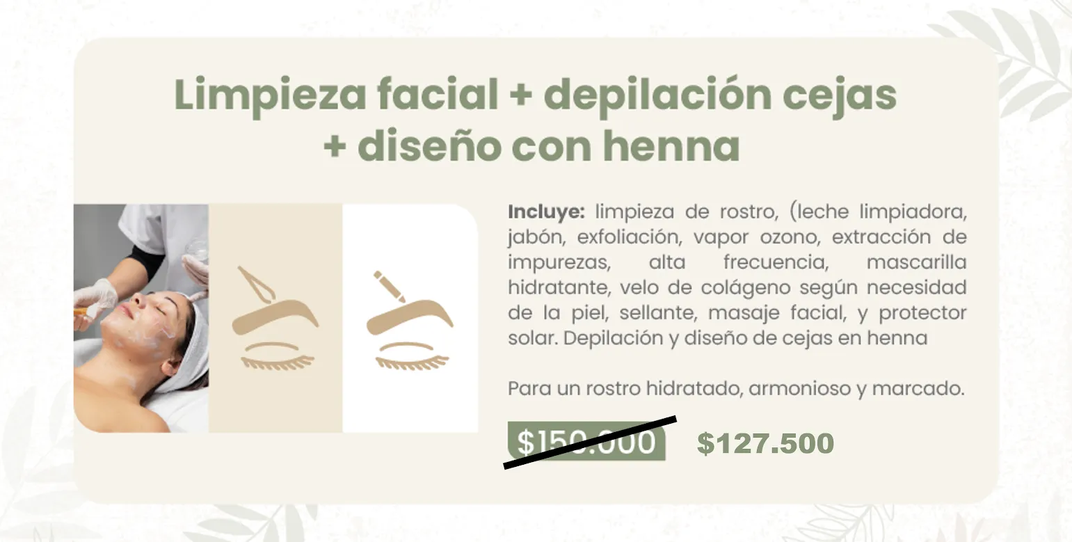 Incluye limpieza de rostro, leche limpiadora, jabón, exfoliación vapor ozono, extracción de impurezas con alta frecuencia, mascarilla hidratante, velo de colágeno según necesidad de la piel, sellante, masaje facial y protector solar. Depilación y diseño de cejas en jena para un rostro hidratado, armonioso y marcado.