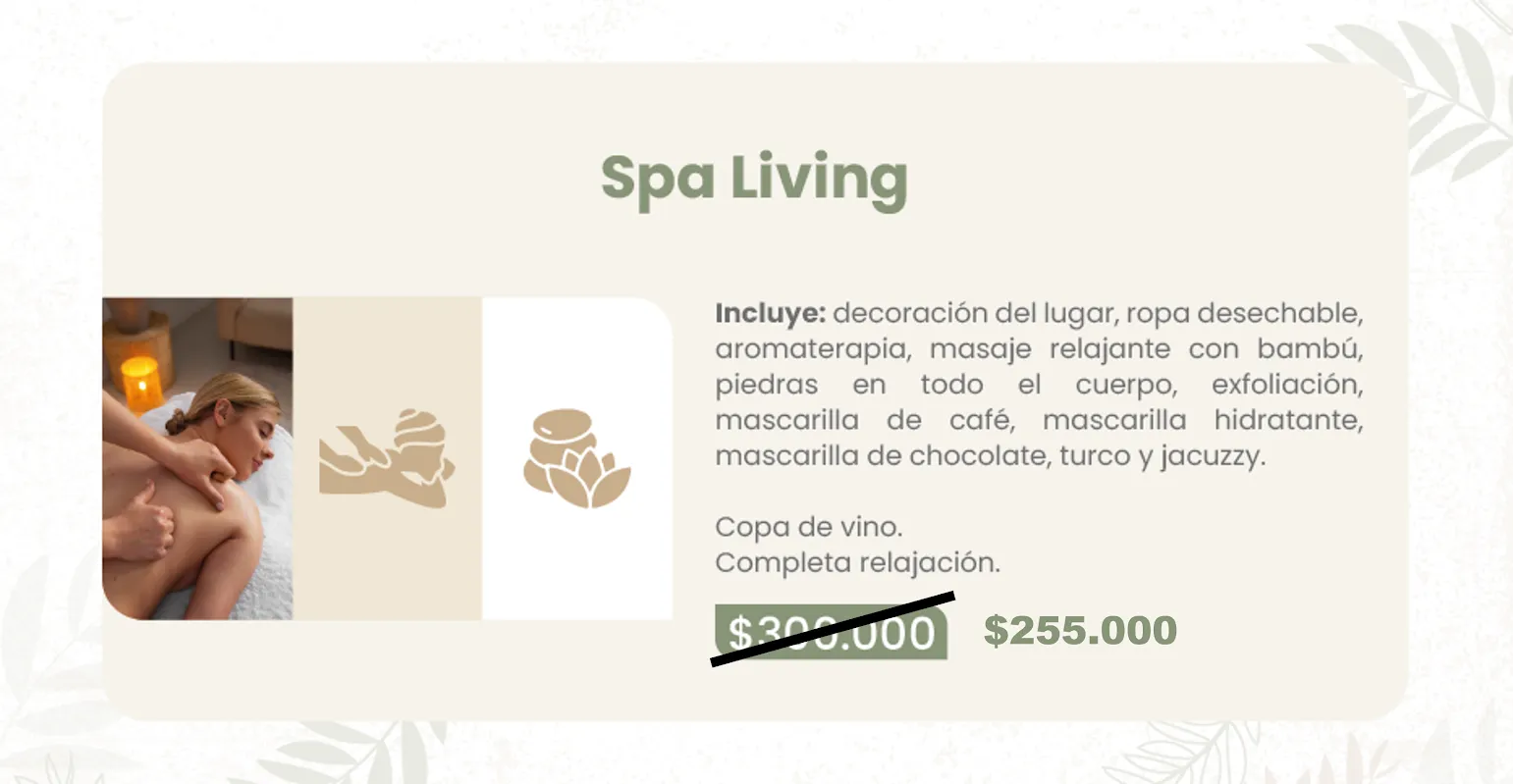 Incluye decoración del lugar ropa desechable aromaterapia, masaje relajante con bambú, piedras en todo el cuerpo, exfoliación, mascarilla de café coma mascarilla hidratante, mascarilla de chocolate, turco y jacuzzi copa de vino y completa relajación.